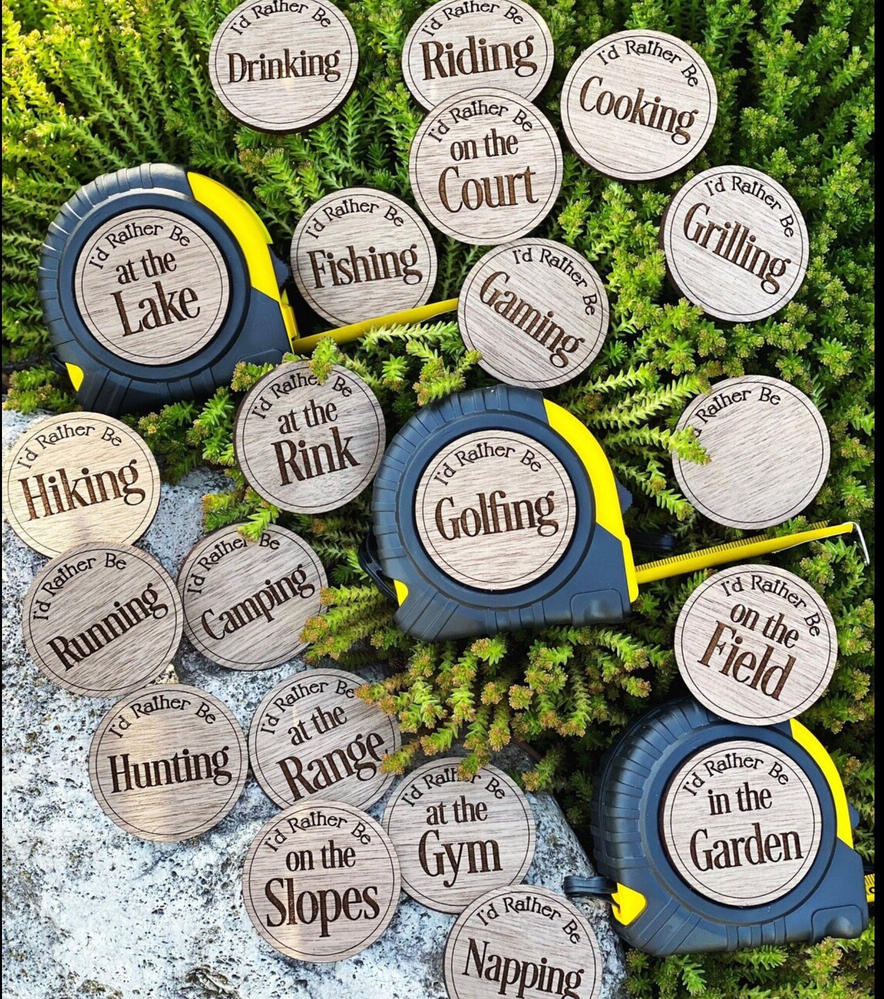 Crafted with care, it's the perfect blend of functionality and sentiment. Engraved with the lighthearted message, "I'd Rather Be," this tape measure acknowledges the many roles a father, husband, or father-in-law plays in life. Whether it's fishing, golfing, or pursuing a favorite hobby, this gift captures the essence of what brings joy and passion to their lives. It's a reminder that even in the midst of everyday tasks, there's always a preferred activity that makes their heart sing.